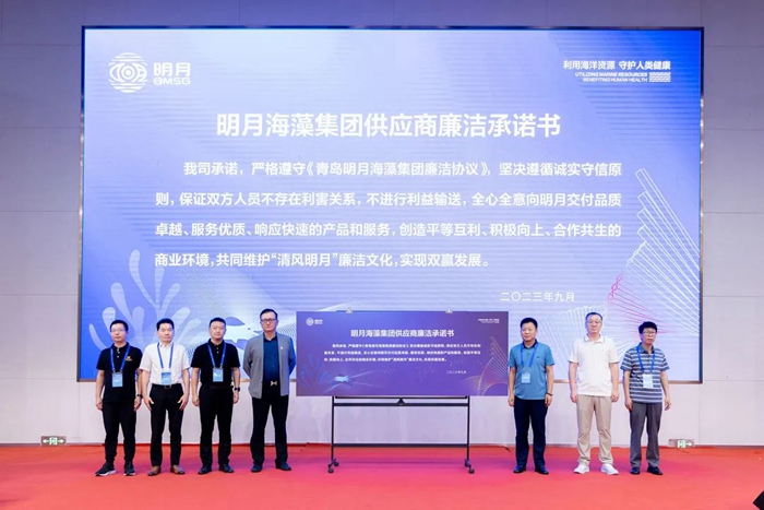 隨后,在集團(tuán)副總裁李振廣詳盡地為大家解讀供應(yīng)商管理和質(zhì)量管理體系的相關(guān)內(nèi)容后,7家戰(zhàn)略供應(yīng)商代表上臺(tái)簽訂《青島明月海藻集團(tuán)供應(yīng)商廉潔承諾書》。