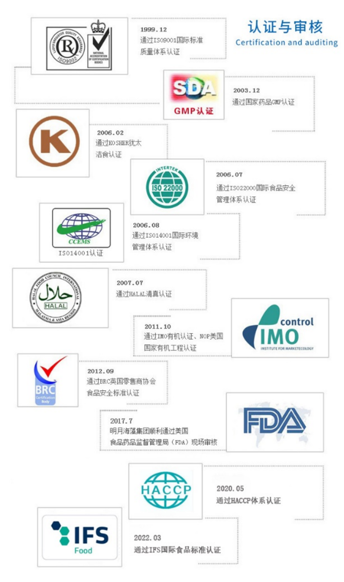 質量是企業的立身之本、發展之基、信譽之源。企業改制25年以來,明月海藻集團始終堅持“堅持質量至上,滿足顧客期望,確保技術優勢,領先市場競爭”的質量方針,建立了一套科學化、數字化、網格化的全員質量管理體系。公司擁有“青島市首席質量官”,擁有高水平的產品質量檢測中心,并通過了ISO9001、ISO22000、ISO14001、BRC、GMP、KOSHER、HALAL等系列認證。